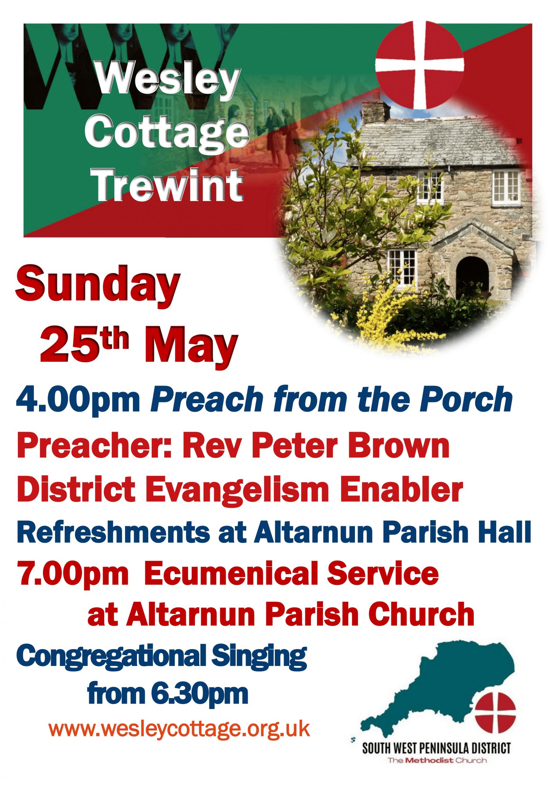 Everyone is welcome to attend this year’s Preach from the Porch at Wesley Cottage, Trewint on Sunday 25th May at 4.00pm with our preacher being Rev Peter Brown, District Evangelism Enabler.