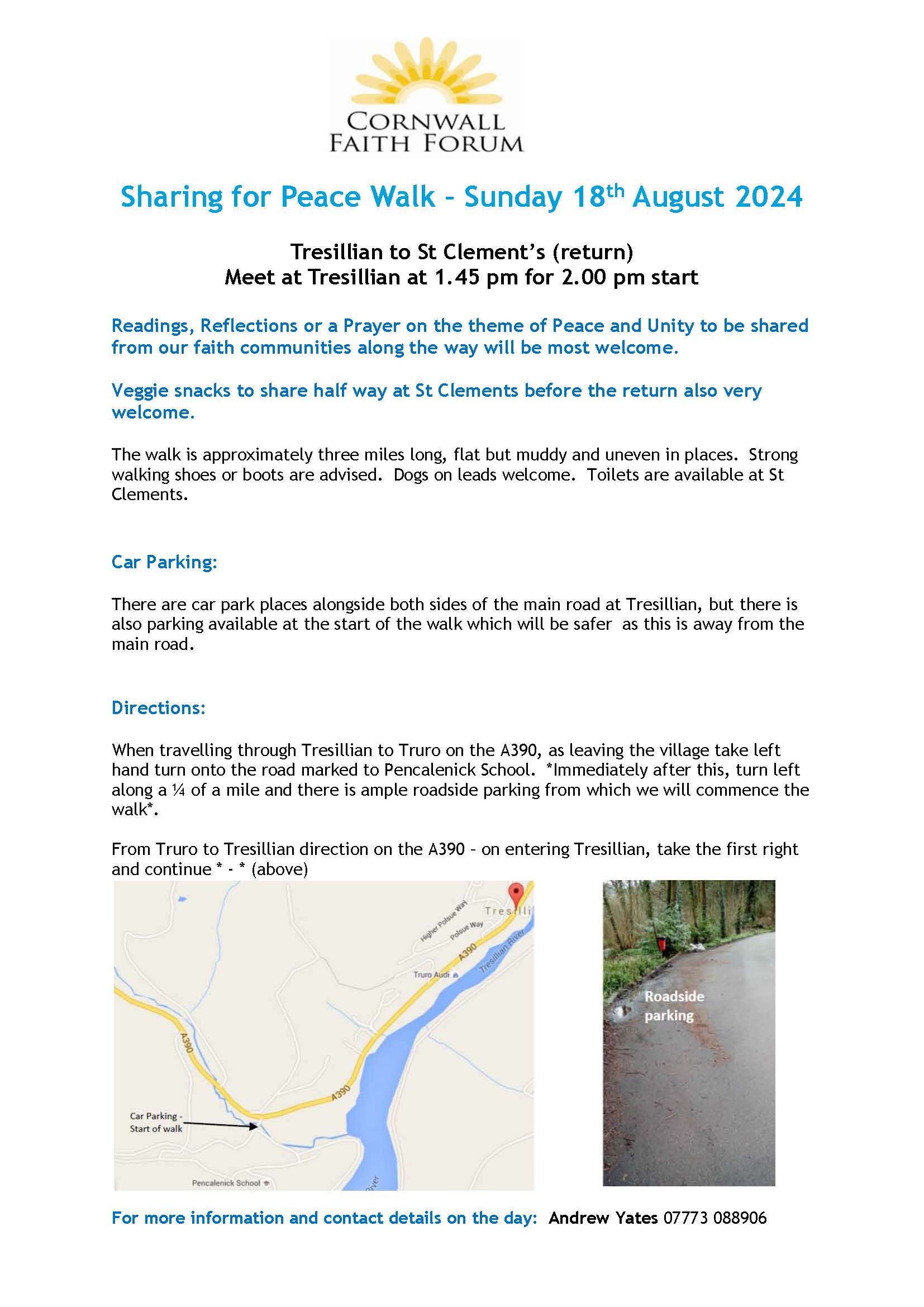 Cornwall Faith Forum’s Sharing for Peace Walk is taking place on Sunday, 18th August from Tresillian to St Clements (and return).ย We will be meeting at Tresillian at 1.45 pm for a 2.00 pm start.ย We shall be sharing readings, reflections or a prayer on the theme of Peace and Unity.ย Originally our theme was going to be on โwaterโ but in the light of current disturbances it was felt the Cornwall Faith Forumโs central theme of peace and common ground was more fitting.ย You may wish to bring some veggie snacks to share half way at St Clements before the return.ย The walk is approximately three miles long, flat but muddy and uneven in places.ย Strong walking shoes or boots are advised.ย Dogs on leads welcome.ย Toilets are available at St Clements.ย For more information and contact details on the day:ย Andrew Yates 07773 088906.