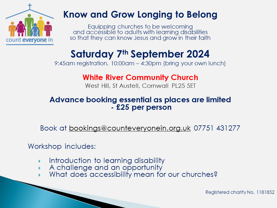 There will be a training day, on Saturday 7th September, in St Austell.  This is being run by Count Everyone In, to provide training on inclusive worship, and ministering to people with additional needs.