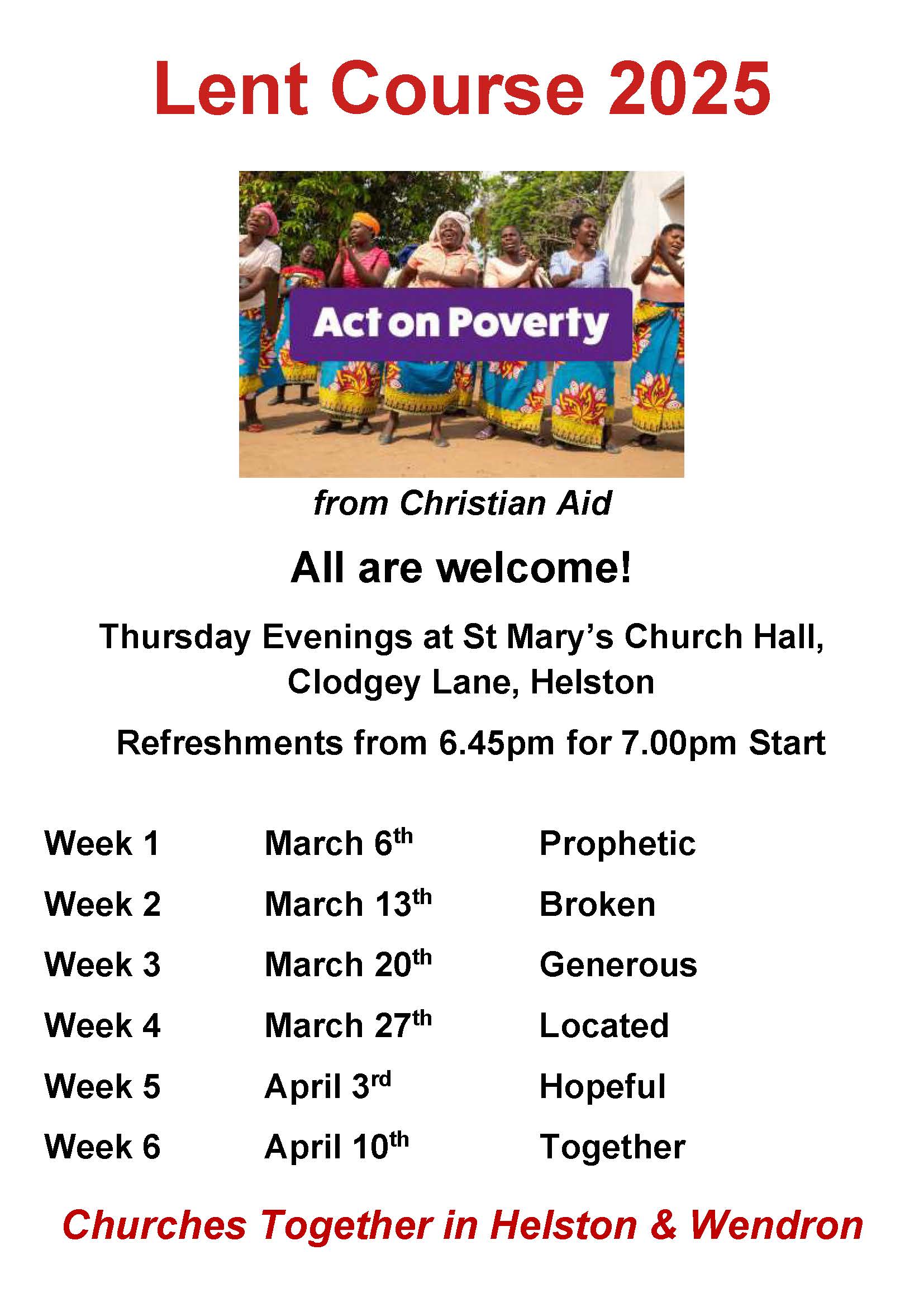 A Lent Course called ‘Act on Poverty’ consisting of a series of 6 sessions on 6 consecutive Thursdays in Lent from ย March 6th – April 10th based on a course produced by Christian Aid. All are welcome to attend and we meet at 6.45 pm for refreshments before starting at 7pm at St. Mary’s Church Hall, Clodgey Lane, Helston. The Lent Course is organised by Churches Together in Helston and Wendron