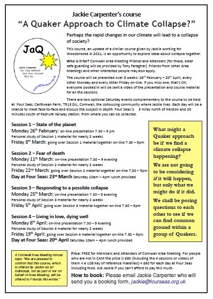 Jackie Carpenter invites you to join an on-line conversation about what Quakers might do if human society found itself in a state of collapse due to the rapid changes in climate. Please see more information in this poster and contact Jackie if you would like to know more: jackie@fourseas.org.uk. You can ask Jackie to repeat the initial session if you can’t join this coming Monday (26th February) – sorry for the short notice. You are welcome to join part-way through the course, and if you’d like to dip in and out, that’s OK too. ยฃ80 or less if you can’t afford that much, even free.