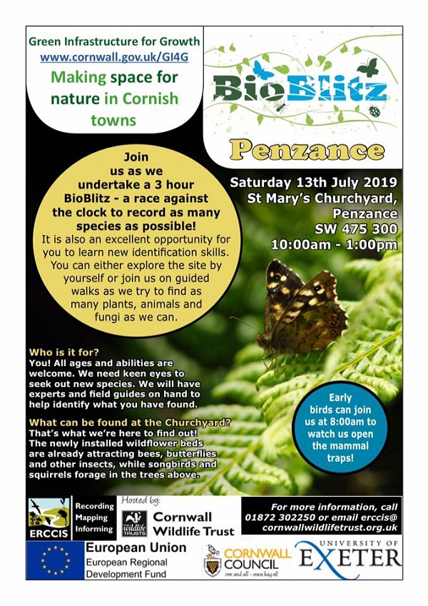 Join us as we undertake a 3 hour BioBlitz – a race against the clock to record as many species as possible in St Mary’s Churchyard, Penzance! All ages and abilities welcome.