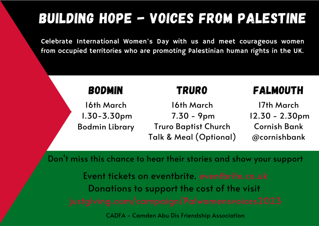 CADFA (The Camden Abu Dis Friendship Association) are hosting 15 women from the Occupied Territories as part of an International Women’s Day tour. Three of these women are coming to Cornwall from 15th-17th of March and some volunteers in Cornwall have organised a few events and speaking engagements. This is to give people in Cornwall a chance to meet these women and hear about their experiences as women and living under occupation.ย