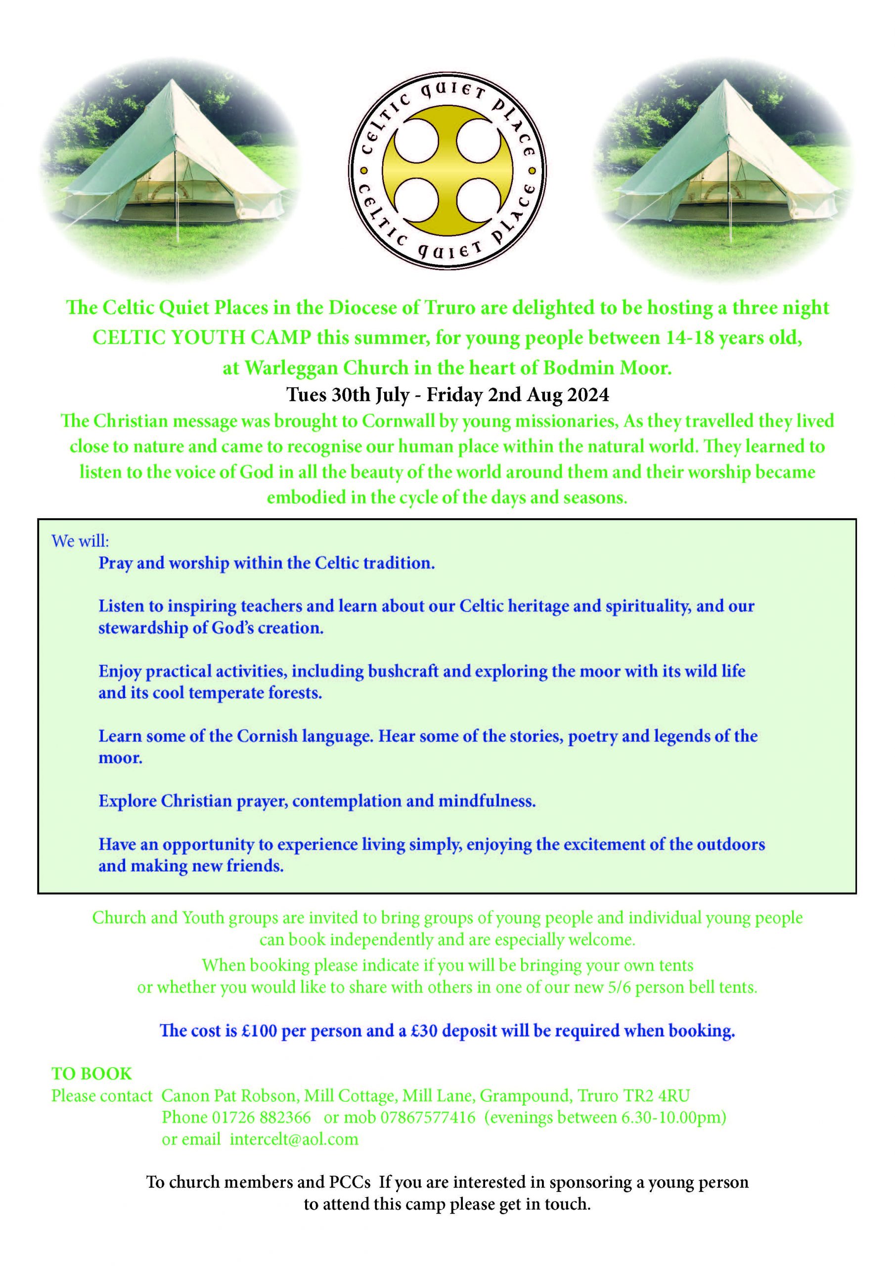 The Celtic Quiet Places in the Diocese of Truro are delighted to be hosting a three night Celtic Youth Camp this summer, for young people between 14-18 years old, at Warleggan Church in the heart of Bodmin Moor.  See flyer for full details here: Summer Camp