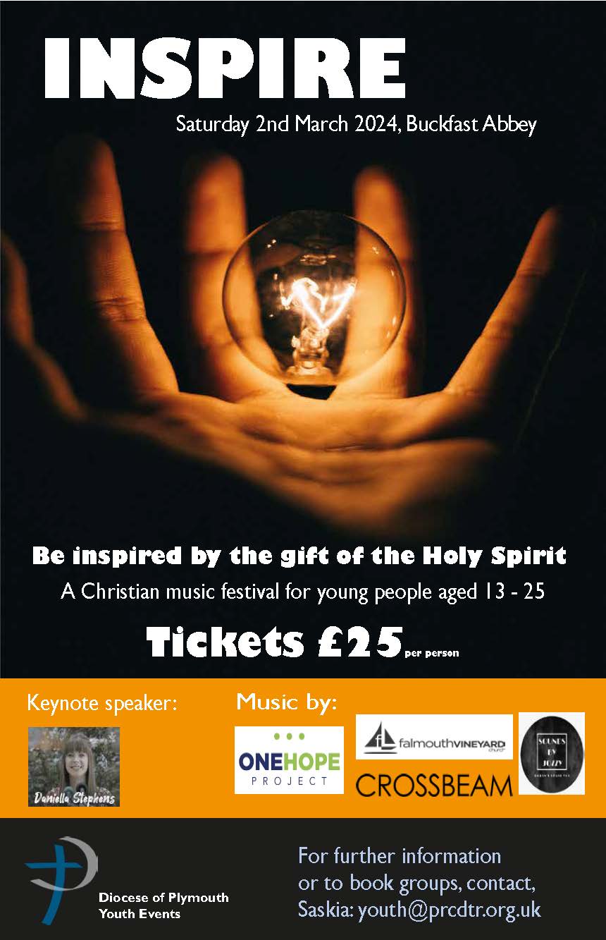 Inspire is on Saturday 2nd March 2024 at Buckfast Abbey. Tickets are ยฃ25. This event is aimed at those aged 13 โ 25. Booking is essential.