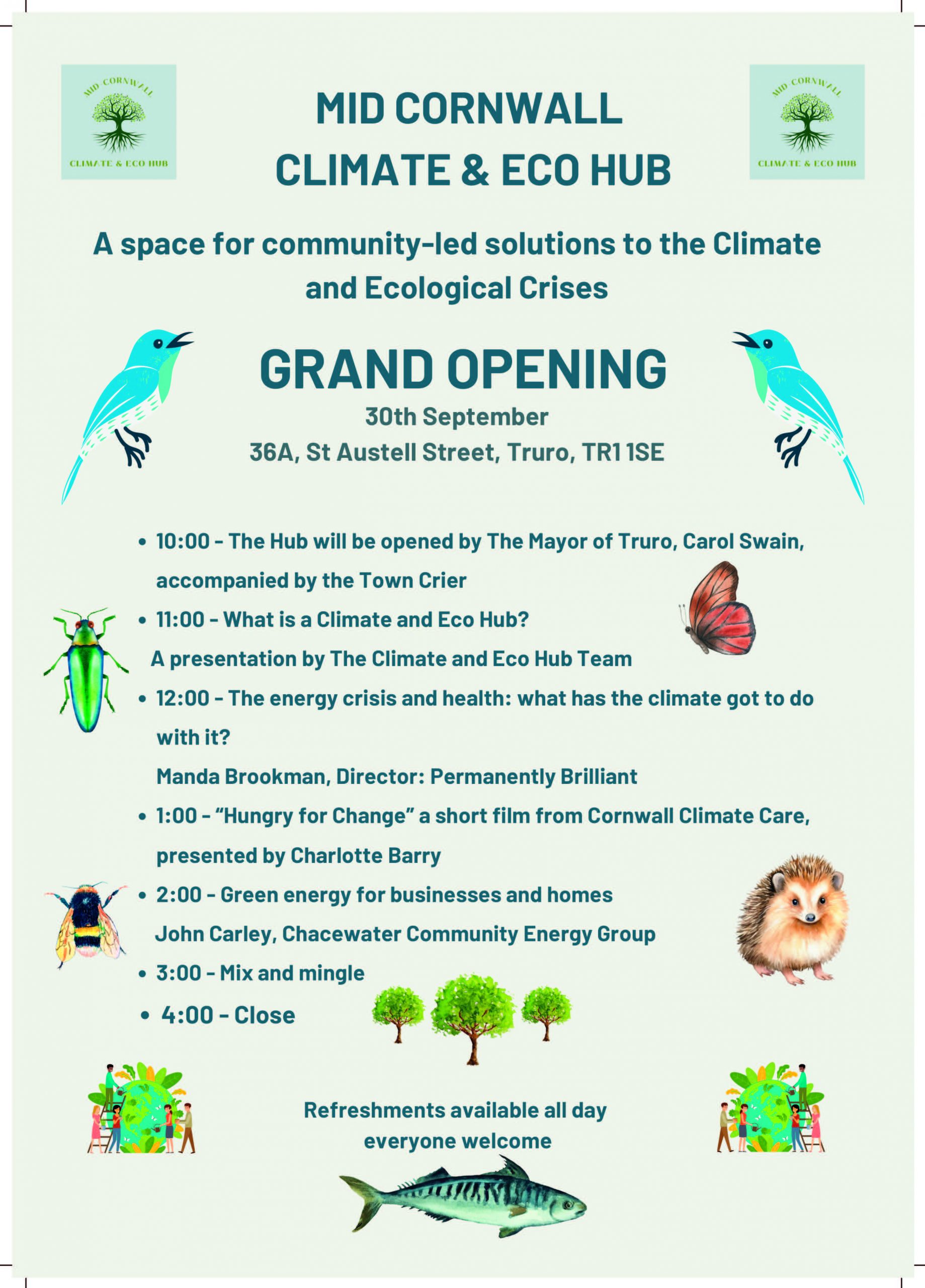 We are delighted to announce the Grand Opening of the Mid-Cornwall Climate and Eco Hub:       Saturday, 30th September, 2023, 10.00-4.00 at 36a, St. Austell Street, Truro, Cornwall, TR1 1SE