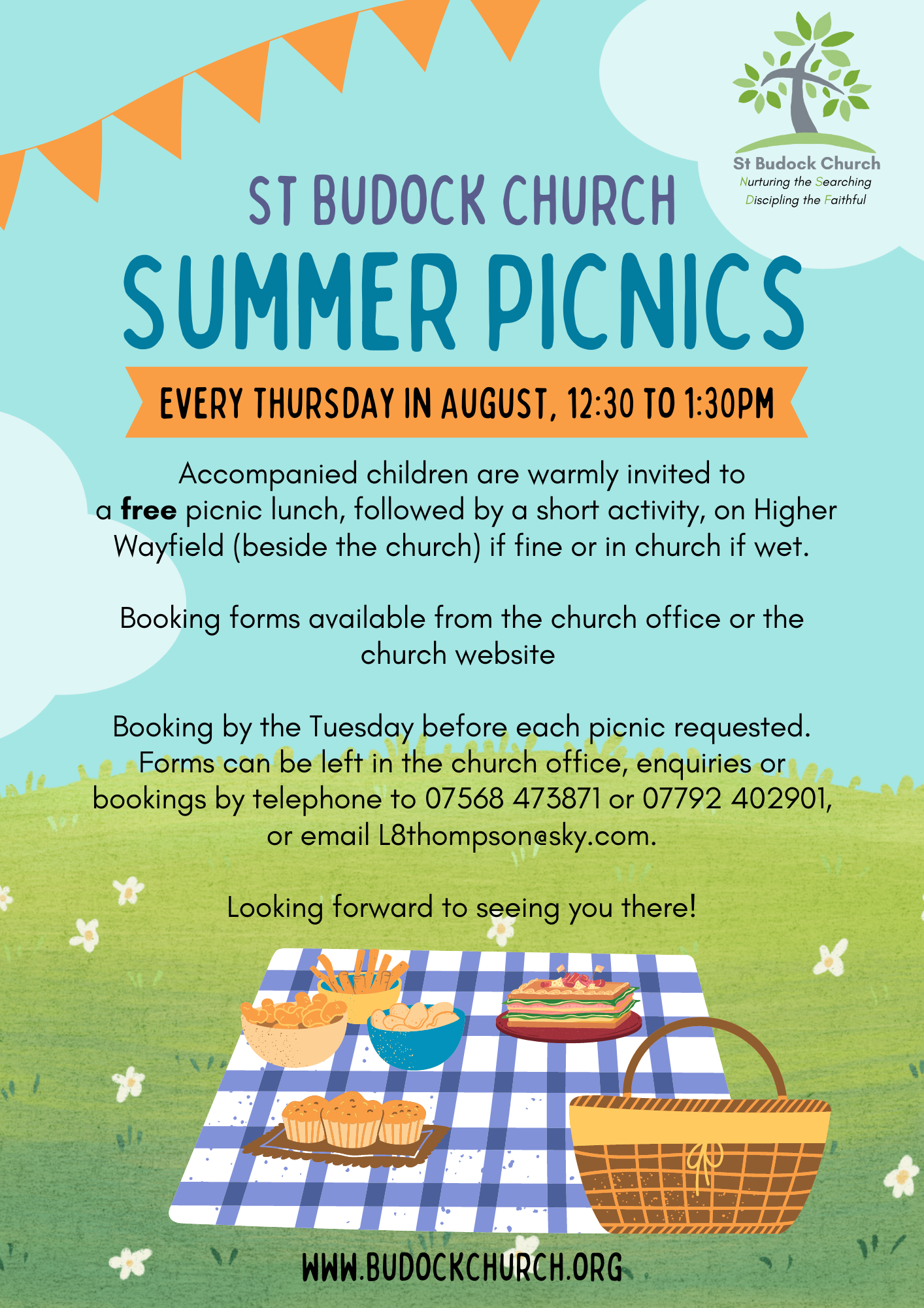 Booking by the Tuesday before each picnic is requested. Forms can be left in the church office, enquiries or bookings by telephone to 07568 473871 or 07792 402901, or email L8thompson@sky.com.