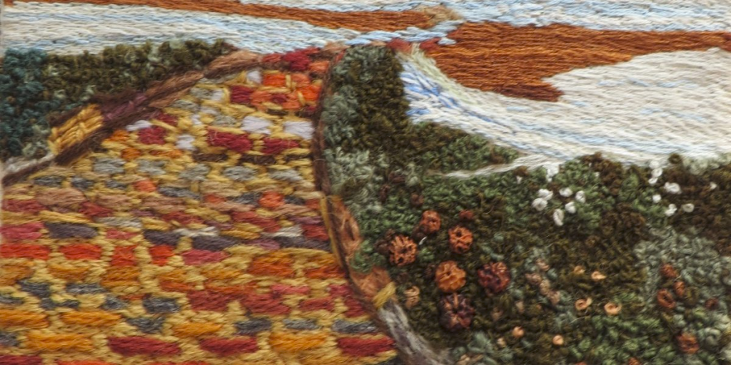 To celebrate its 50th anniversary and to showcase its membersโ skills, West Country Embroiderers is exhibiting embroideries of the South West coast path from its start in Dorset, around Devon and Cornwall and finishing at the Devon/Somerset border on the north coast.ย Members from across the organisation have embroidered 166 panels to illustrate landmarks along the path, using any stitching technique they wish. The A5-sized vertically worked embroideries are unframed, but displayed consecutively so that the viewer โwalksโ the coast path. ย A stitched map of the Coastline is included and panels marking the county borders have also been inserted.ย