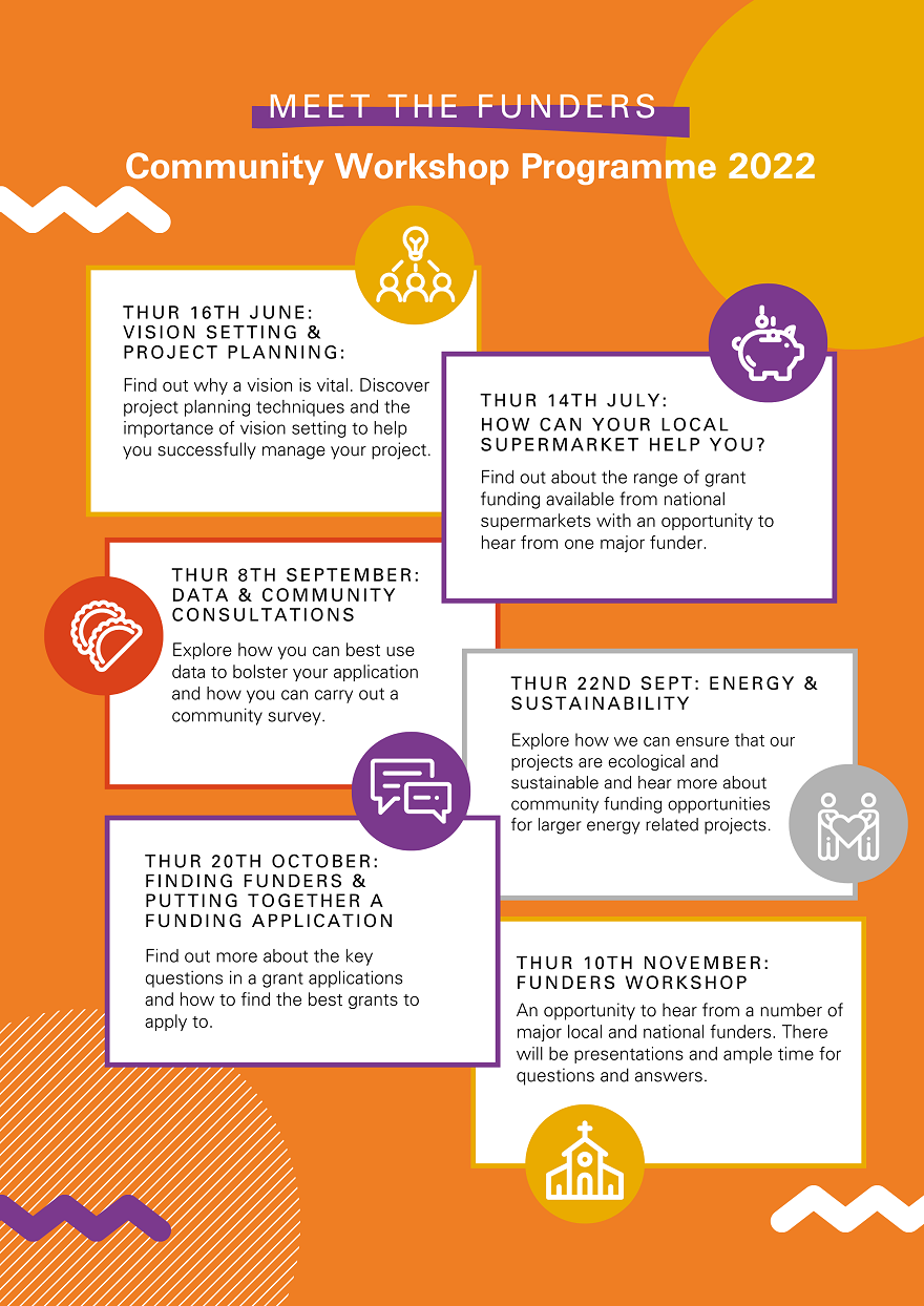 The Meet the Funders programme runs throughout the year, with our spring event followed up with a series of community workshops designed to take you every step of the way in setting up and strengthening your community projects.