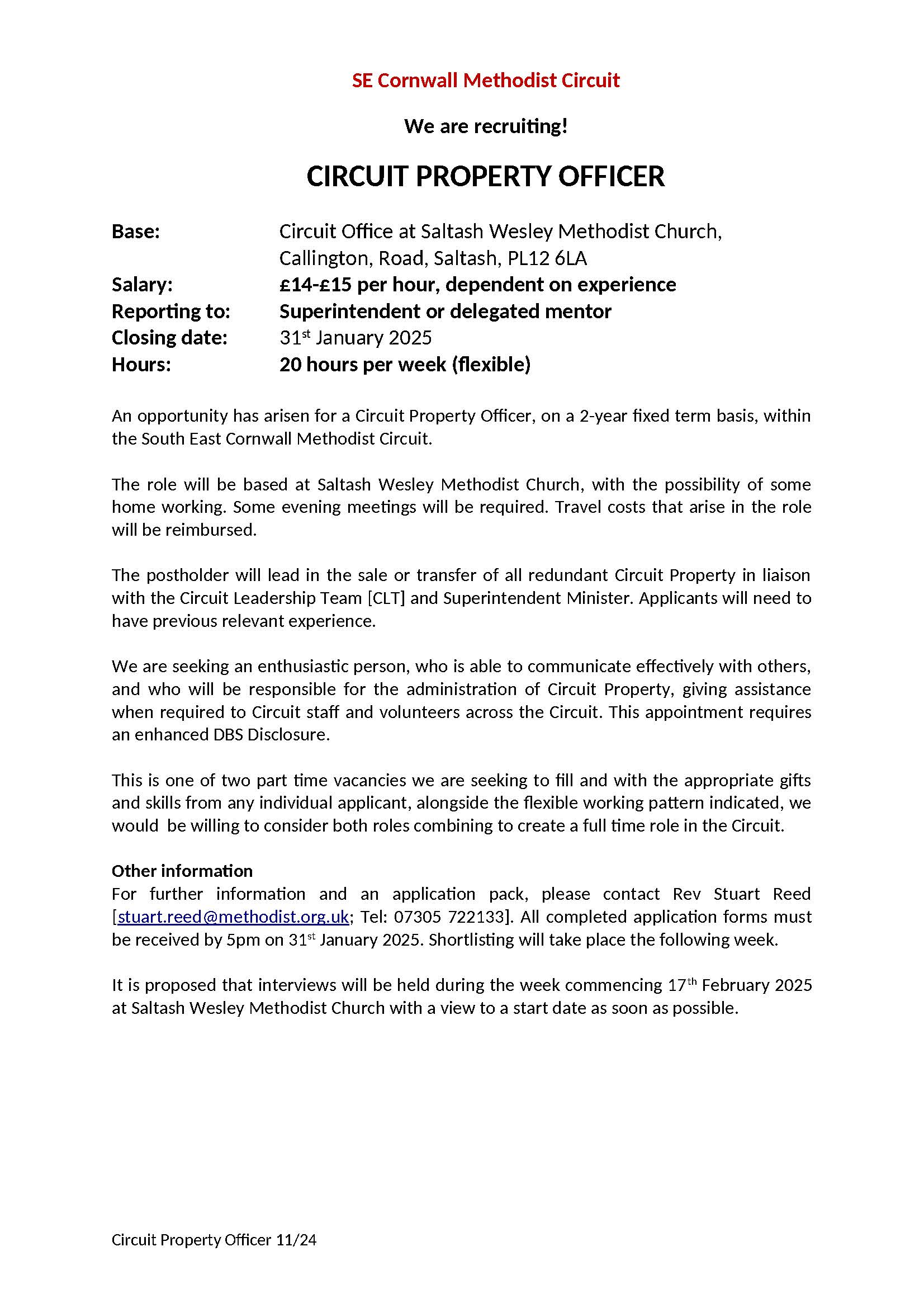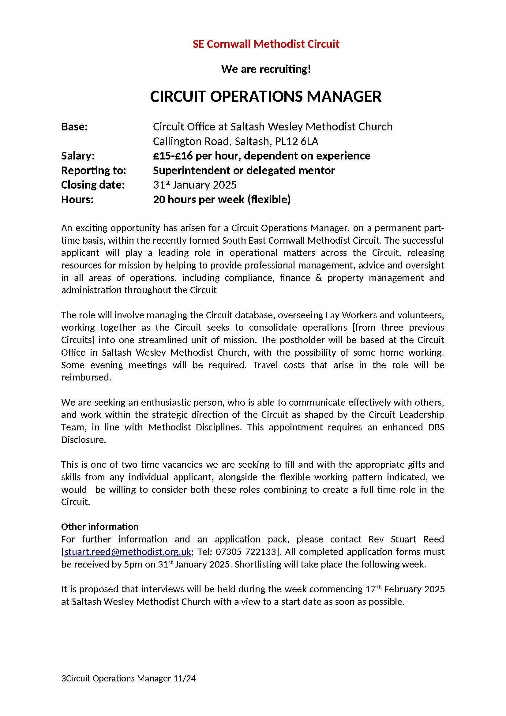 Vacancies: Operations Manager and Property Officer, SE Cornwall Methodist Circuit : closing date: 31 Jan