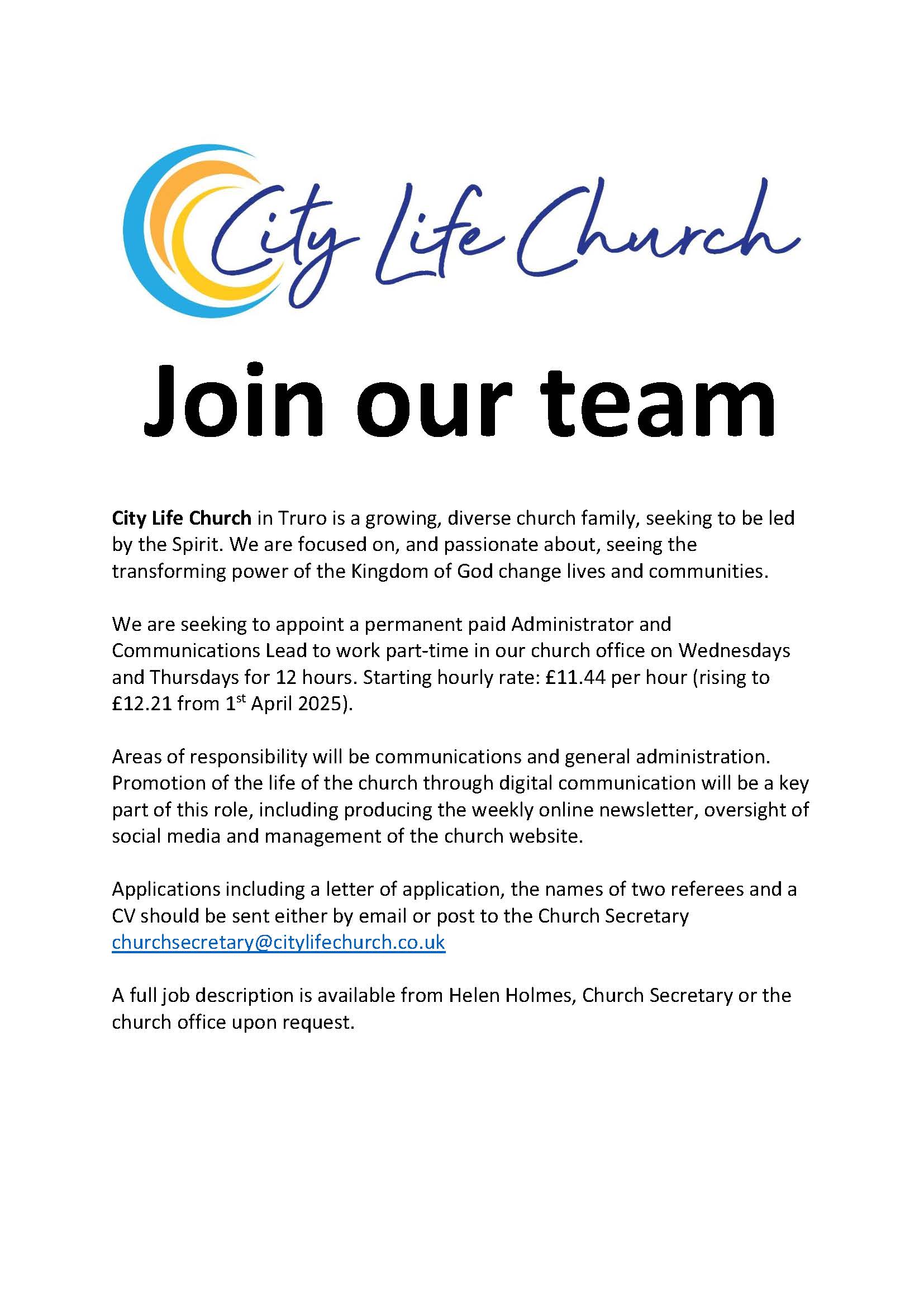 Vacancy: Administrator and Communications Lead, City Life Church, Truro